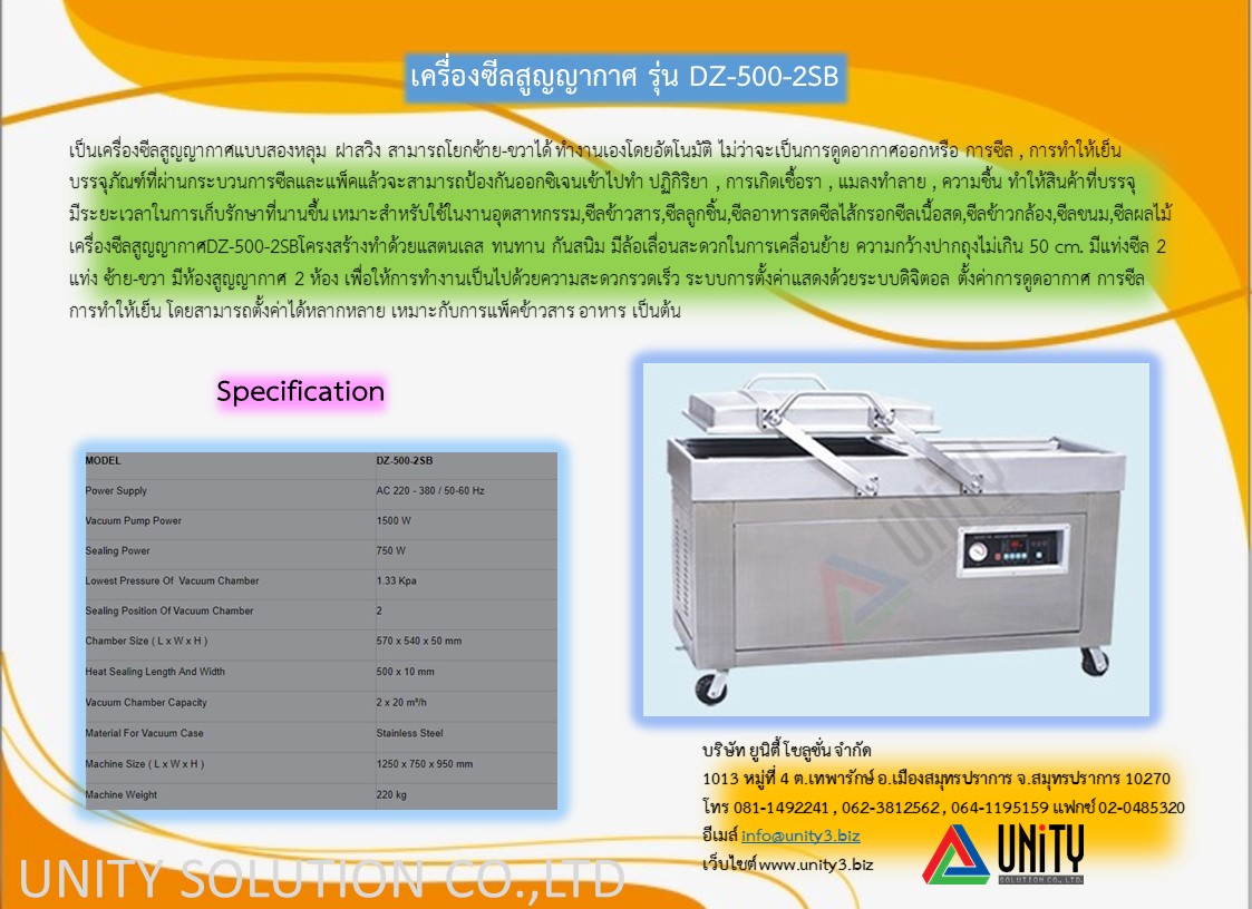 เครื่องซีลสูญญากาศDZ-500-2SB โครงสร้างทำด้วยสแตนเลส ทนทาน กันสนิม มีล้อเลื่อนสะดวกในการเคลื่อนย้าย ความกว้างปากถุงไม่เกิน 50 cm. มีแท่งซีล 2 แท่ง ซ้าย-ขวา มีห้องสูญญากาศ 2 ห้อง เพื่อให้การทำงาน
