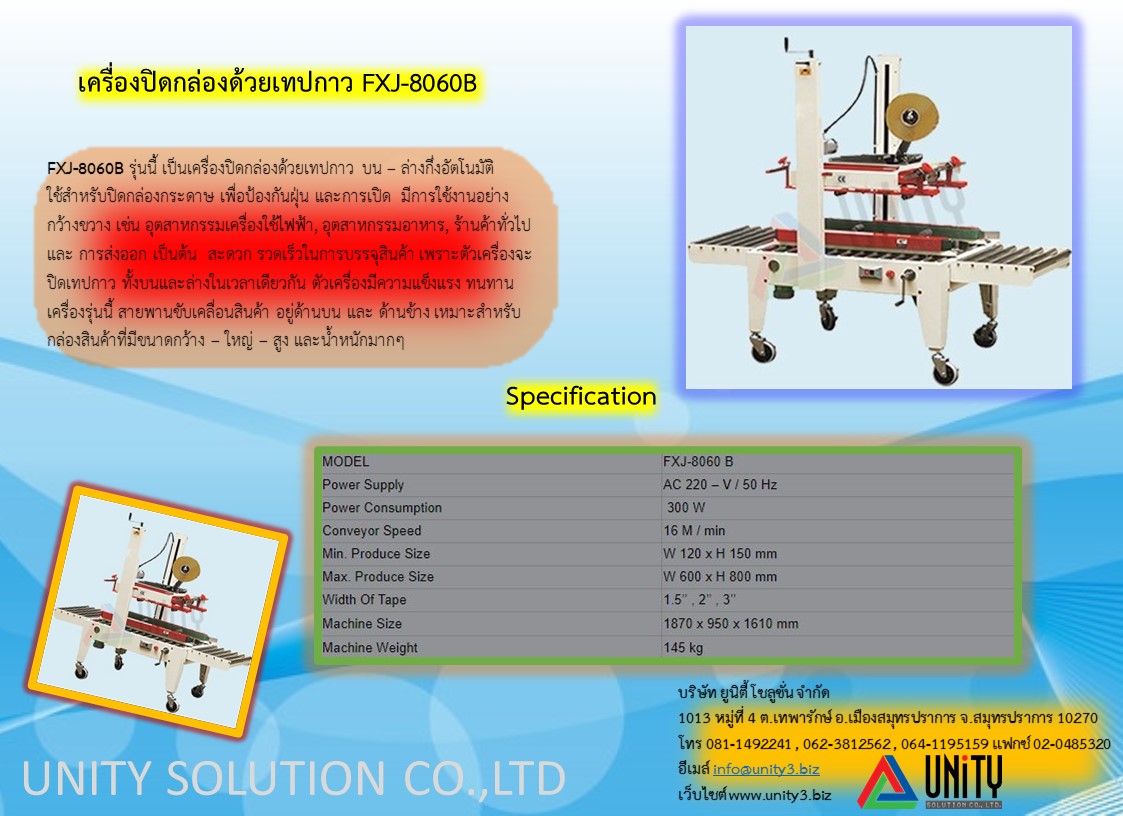 FXJ-8060B รุ่นนี้ เป็นเครื่องปิดกล่องด้วยเทปกาว บน – ล่างกึ่งอัตโนมัติ ใช้สำหรับปิดกล่องกระดาษ เพื่อป้องกันฝุ่น และการเปิด มีการใช้งานอย่างกว้างขวาง เช่น อุตสาหกรรมเครื่องใช้ไฟฟ้า, อุตสาหกรรมอาหาร, ร้านค้าทั่วไป และ